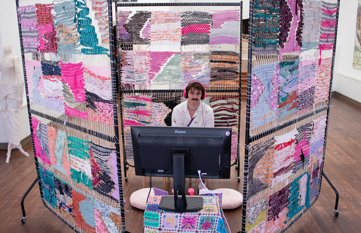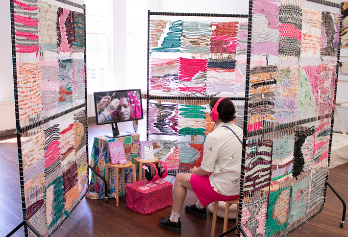 In order to exhibit this research, I felt it was just as important to have a textile installation as it was to show the film. I created 48 handwoven tiles from the scraps and off-cuts of all the sewing projects featured in the work. I’ve always been sentimentally attached to fabric and tend to hold onto remnants for far too long. Weaving them became a way to honour the material — and, over time, it grew into a metaphor within my practice.